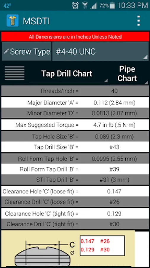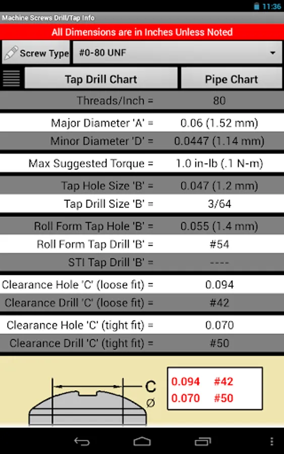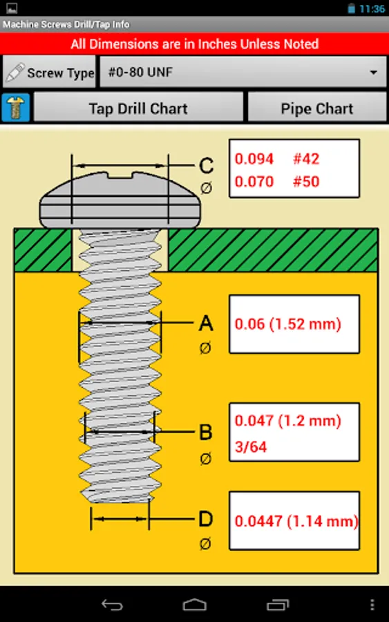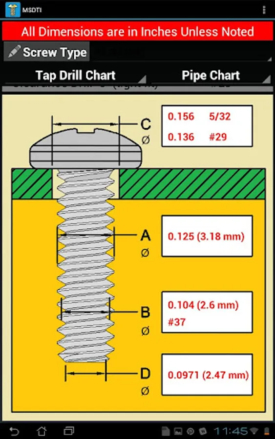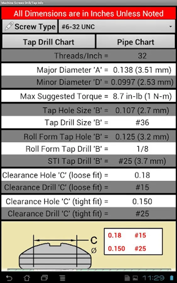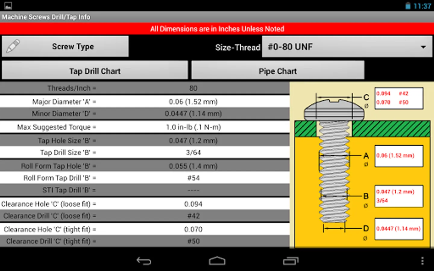 Android's first and best drill chart and tap drill information app for machine screws with thread sizes, tap drill diameter sizes, clearance holes, STI drill information, & suggested max torques. Handy fraction to decimal drill chart and NPT / NPS / BSPT / BSPP pipe thread charts included.