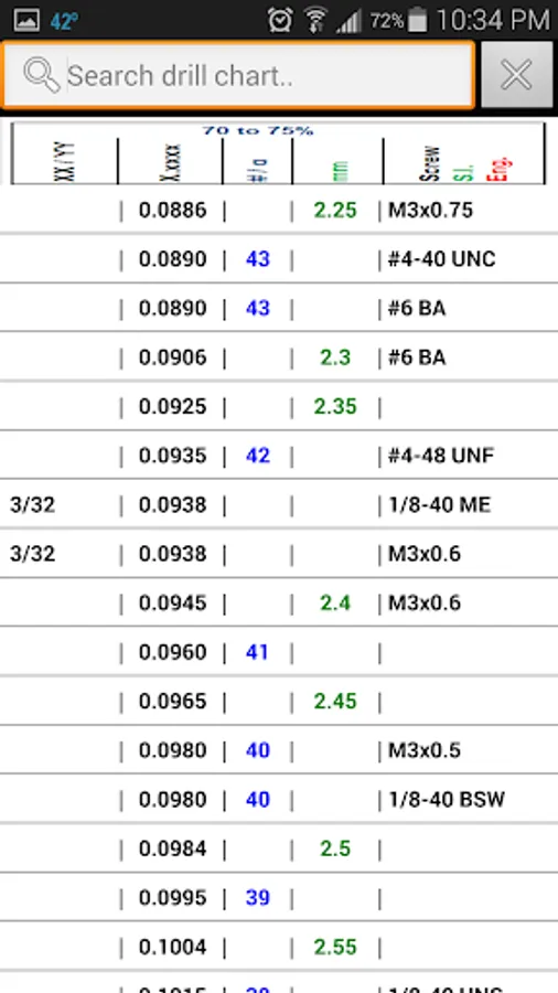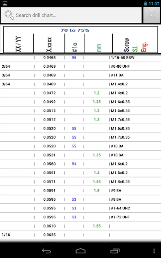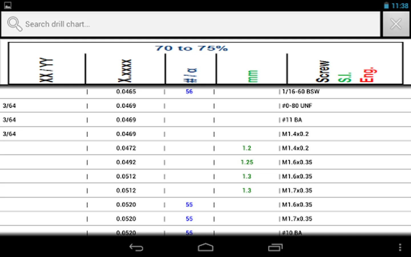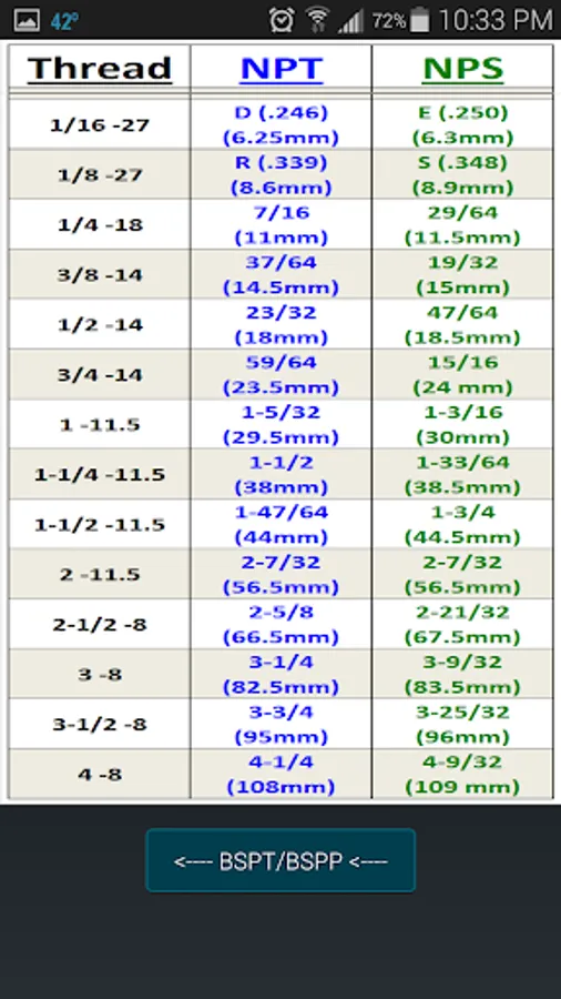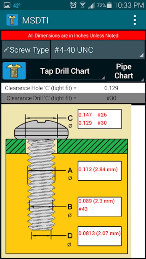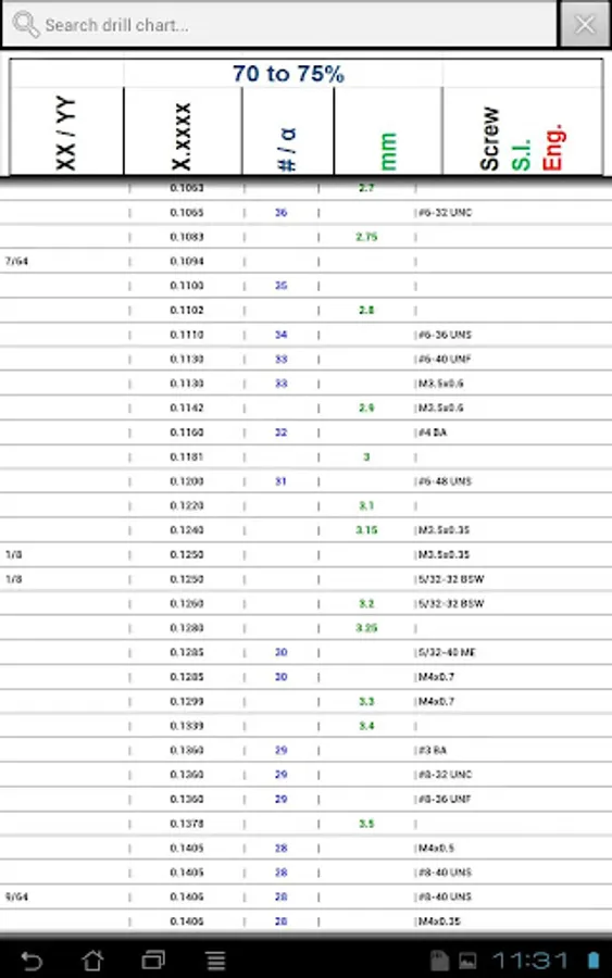 Android's first and best drill chart and tap drill information app for machine screws with thread sizes, tap drill diameter sizes, clearance holes, STI drill information, & suggested max torques. Handy fraction to decimal drill chart and NPT / NPS / BSPT / BSPP pipe thread charts included.