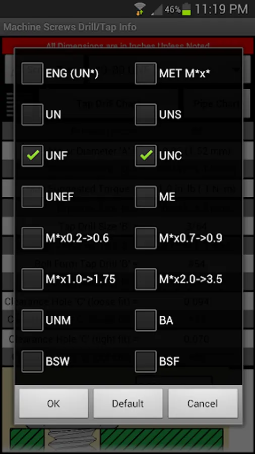 United National Coarse (UNC), United National Fine (UNF), United National Extra Fine (UNEF), United National Special (UNS), Metric Course, Metric Fine, Metric Extra Fine, (ME) Model Engineering, (BA) British Association Standard, (BSW) British Standard Whitworth, (BSF) British Standard Whitworth Fine