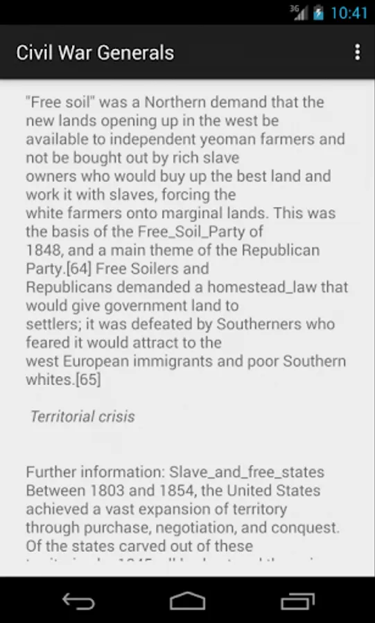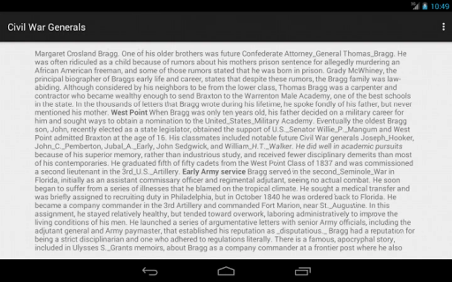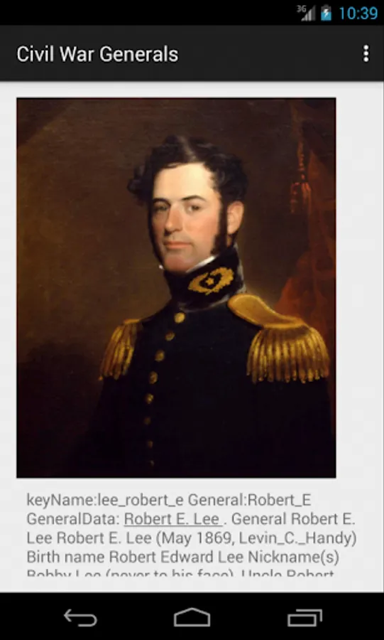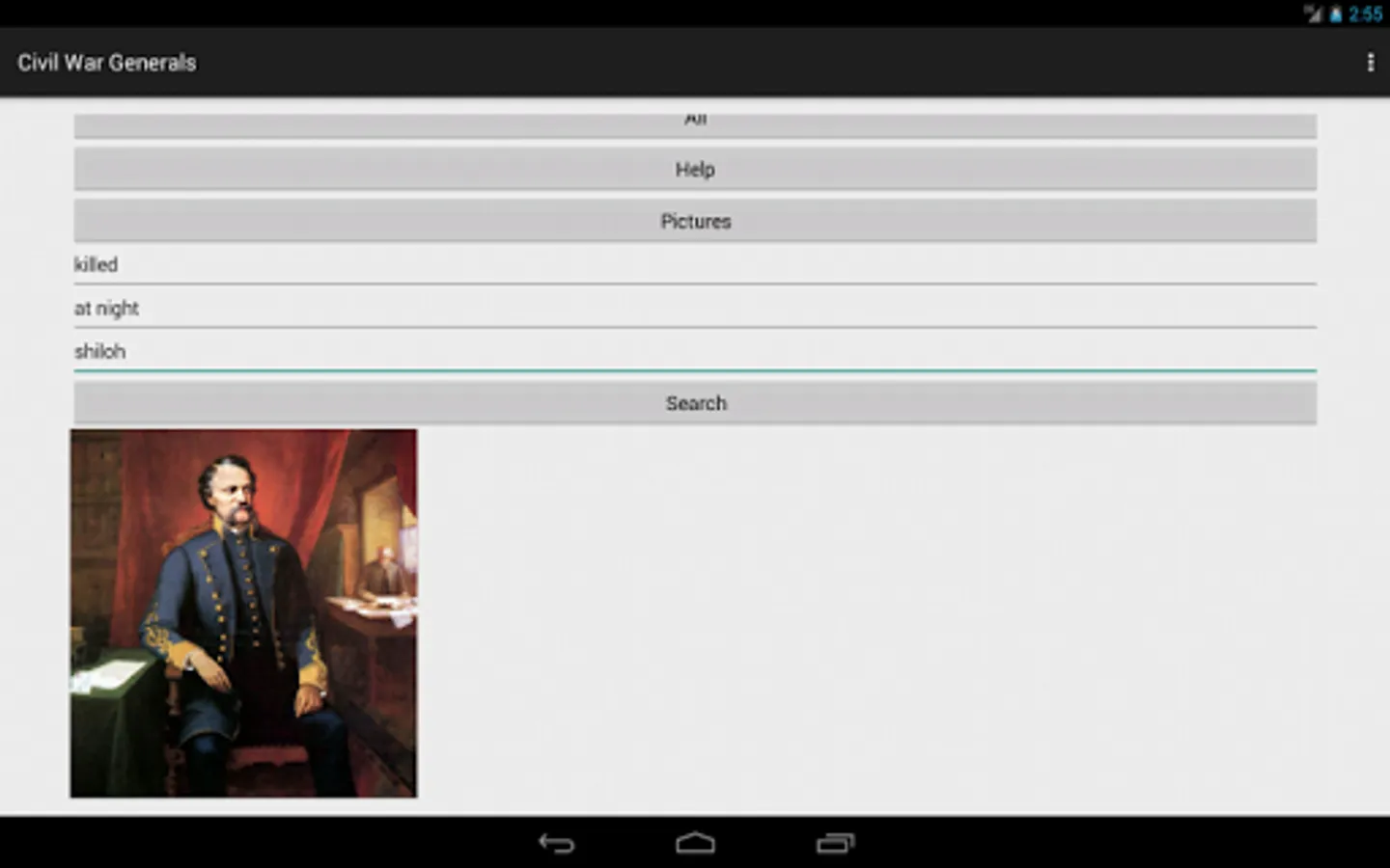 Civil War Generals contains facts and history of all generals of the US Civil War. There is a page for every general, hundreds of images and a searchable database. The Pictures button allows you to scroll through a long list of generals. The three text boxes, and their triggering Search button, search the database of text associated wth every general.