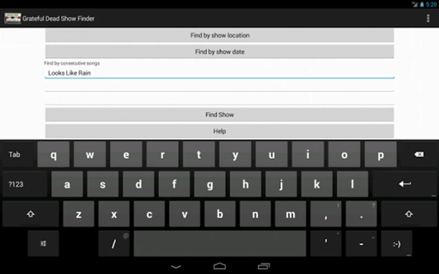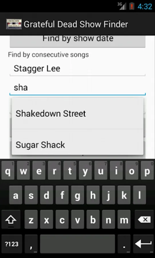 This application works because Jerry Stratton kindly compiled and shared his database of Dead shows (still available at gdead.berkeley.edu). Unfortunately, the database has some modest inconsistency that makes this application less useful. For example, when selecting a song and typing Fire, and waiting a moment, it retrieves two listings for Fire on the mountain. This is because the source database has a case-sensitive difference between two listings. One record says Fire on the Mountain and the other says Fire On the Mountain. This is real problem and will cause some show searches to fail. You will need to search all of the possible combinations to overcome this shortcoming. Finding and correcting these anomalies would be difficult and might introduce other problems. For now, when the song listing choice list shows more than one listing for one song, you will need to check them both.