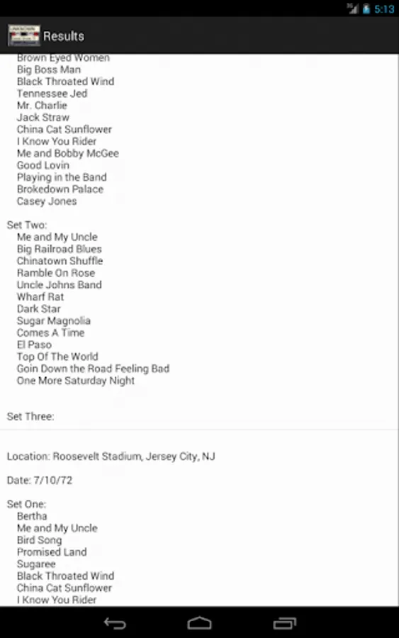 2. The application displays the complete set lists for shows where the song sequence you submitted were played in the same order at the show.