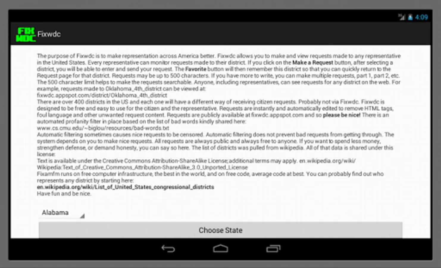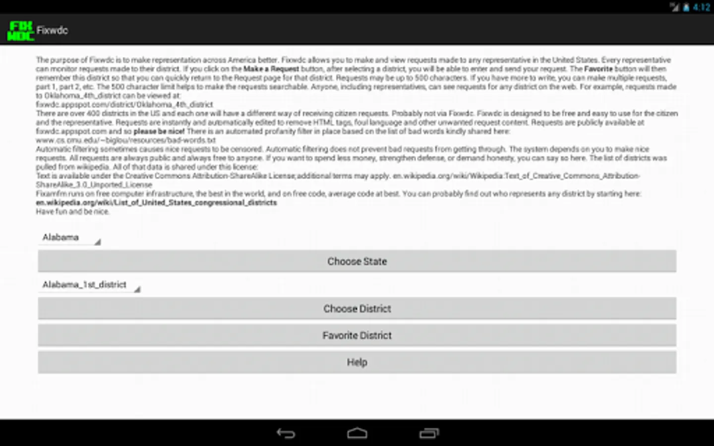 There are over 400 districts in the US and each one will have a different way of receiving citizen requests. Probably not via Fixwdc. Fixwdc is designed to be free and easy to use for the citizen and the representative. Requests are instantly and automatically edited to remove HTML tags, foul language and other unwanted request content. Requests are publicly available at fixwdc.appspot.com and so please be nice! There is an automated profanity filter in place based on the list of bad words kindly shared here: www.cs.cmu.edu/~biglou/resources/bad-words.txt. Automatic filtering sometimes causes nice requests to be censored. Automatic filtering does not prevent bad requests from getting through. The system depends on you to make nice requests. All requests are always public and always free to anyone. If you want to spend less money, strengthen defense, or demand honesty, you can say so here. The list of districts was pulled from wikipedia. All of that data is shared under this license: