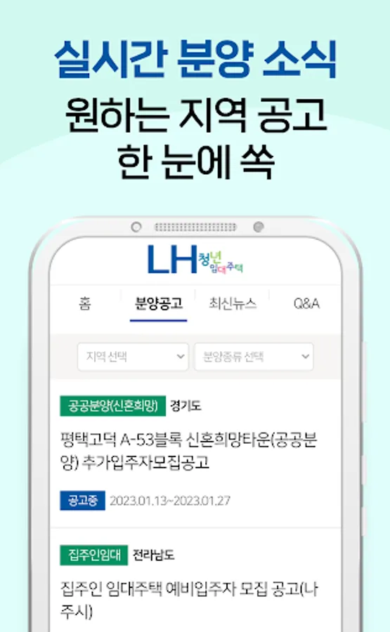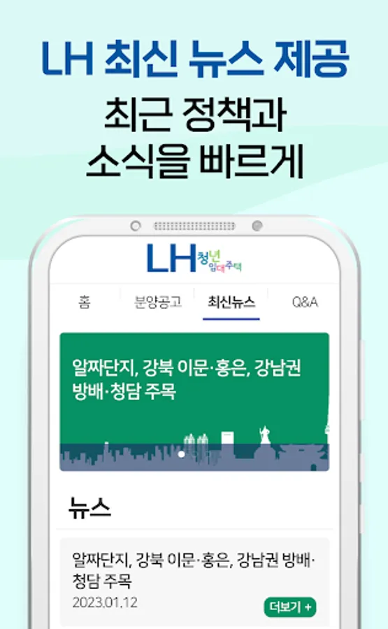You can easily check LH's sales news in 2023 with notifications. Check out various sales announcements such as youth rental housing, youth charter rental, and housing subscription. You can easily find out LH subscription information and the latest real estate policy information and news with one app.