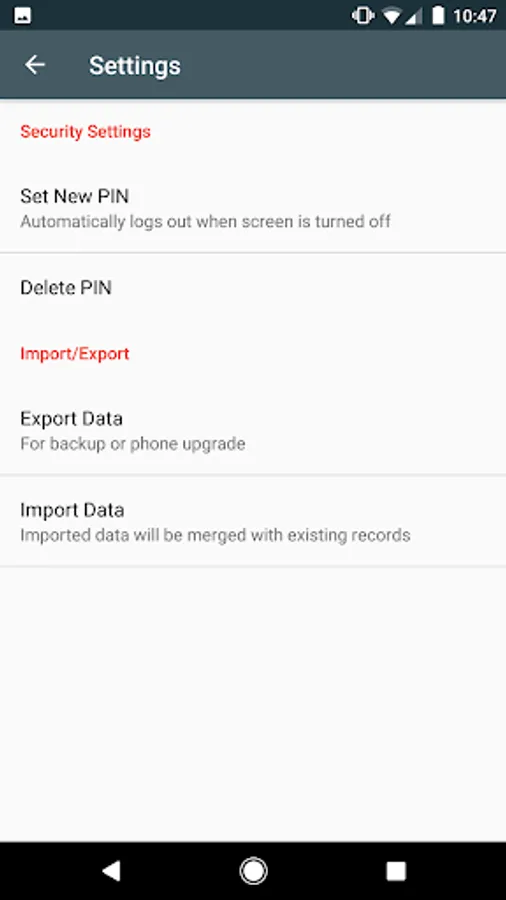 - Optional biometric or PIN login for additional security. The app automatically logs out when the screen is turned off