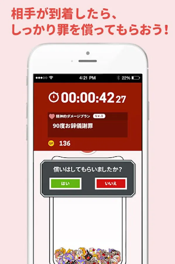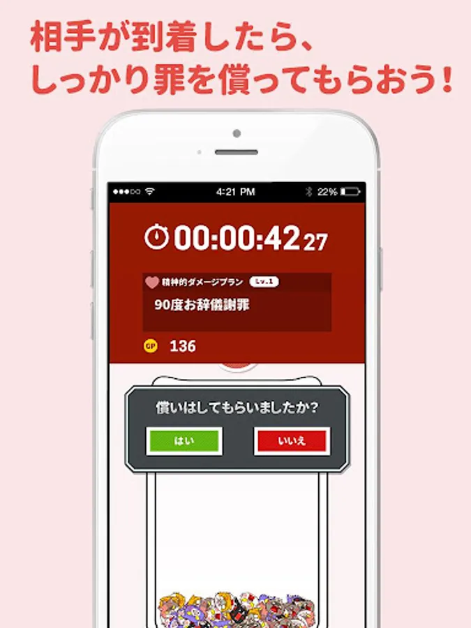 パートナー到着時に遅刻時間とイライラゲームの得点=ギルティポイントを元に償いプランを提示!罪を償ってもらいましょう!