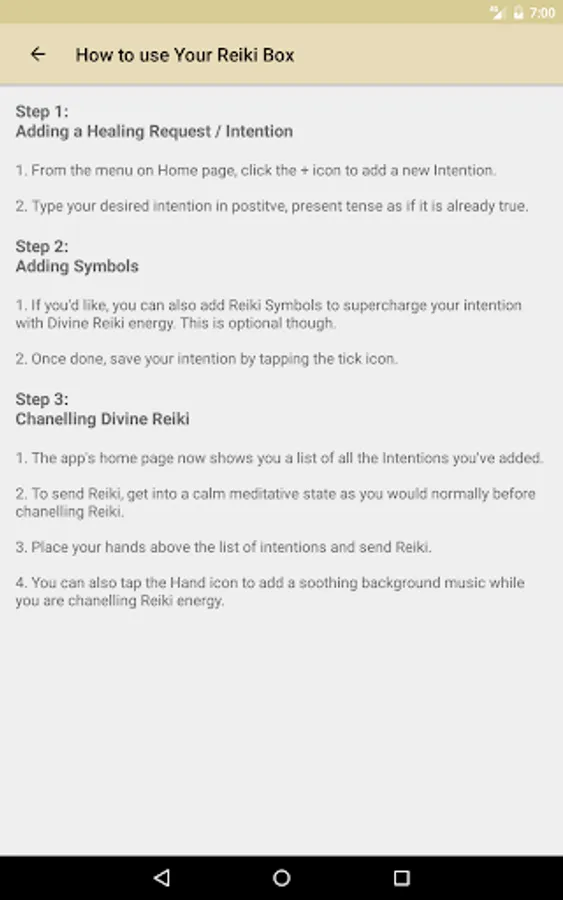 Jayasri Nagrale is a Reiki Level 2 Practitioner. She first created the app for her personal everyday use. Seeing how beneficial it is to have a simple Reiki Box on the go, she decided to share it with other Reiki practitioners across the world.