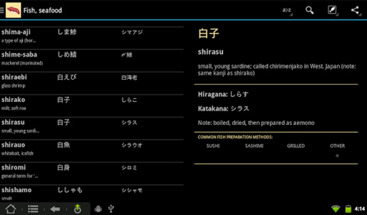 - comprehensive coverage of all Japanese fish and seafood (not just sushi), with information on common preparation methods for each fish - sashimi, tempura, grilled, etc.