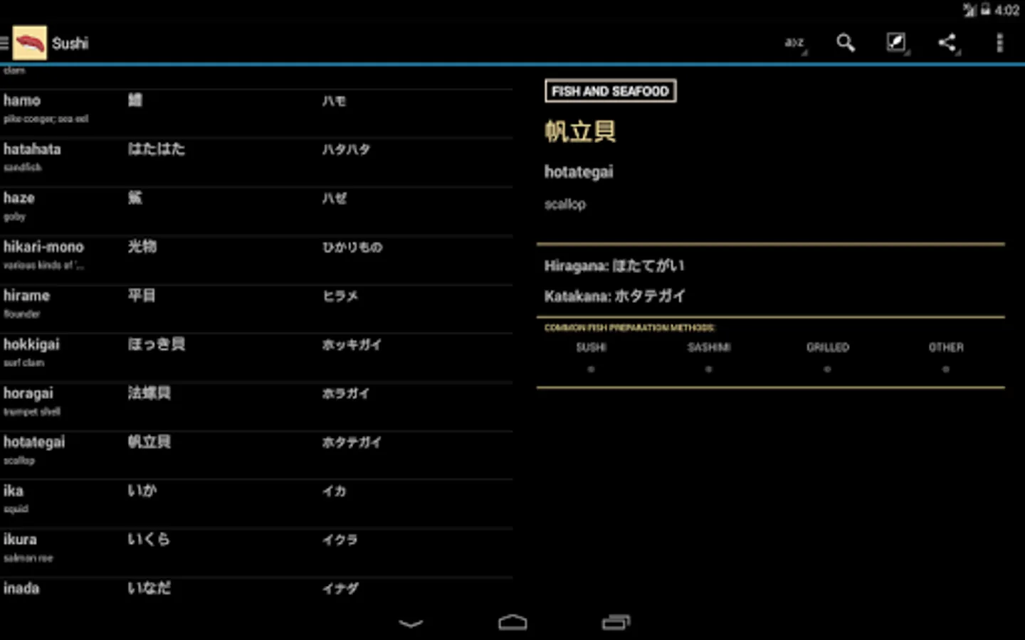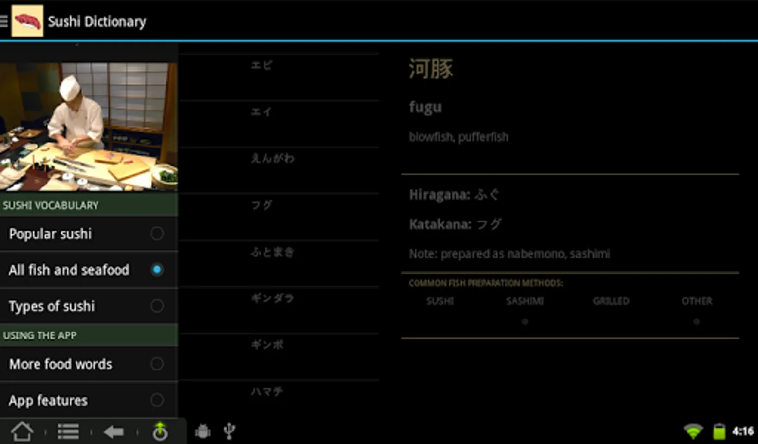 Sushi Dictionary Deluxe (available through in-app upgrade) covers even more Japanese cuisine: