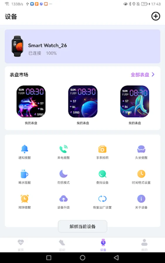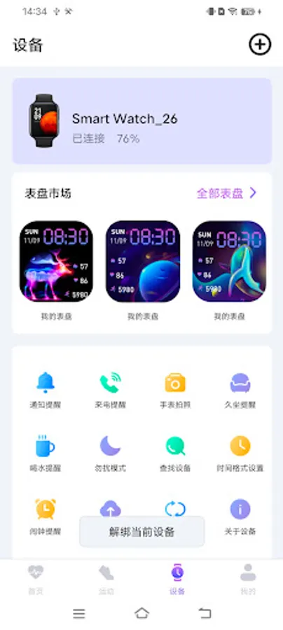 4. You can use the Jingxun smart wearable app to bind and connect the Jingxun smart wearable device Smart Watch on the device page. By turning on the notification switch, you can get other application notification messages. Through the camera function of the watch, use the Smart Watch to control the phone to take pictures and set up sedentary Reminders, drink water reminders, set the time format of the device, change the dial of the device, synchronize the notification data of other applications on the phone, set the alarm clock, perform OTA upgrades on the device, restore the factory and other operations.