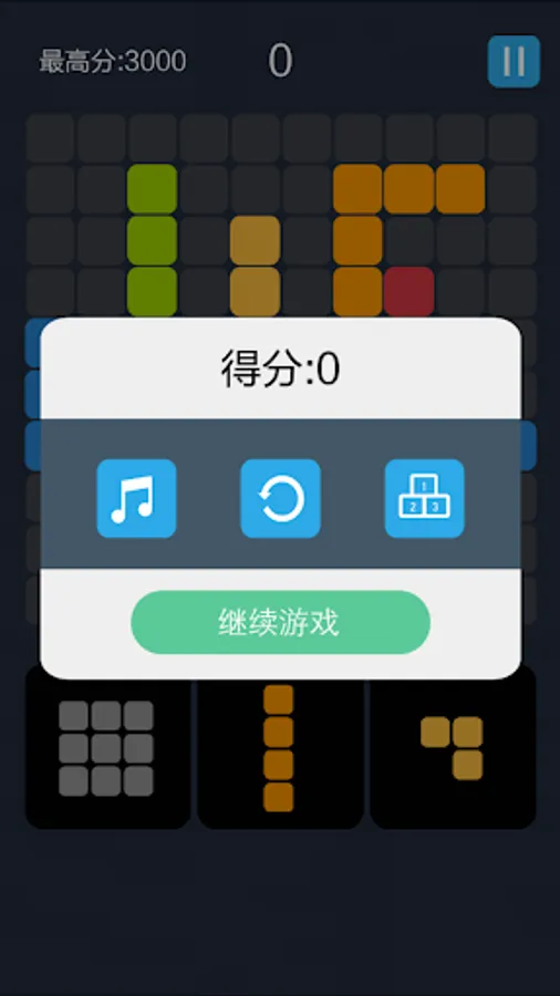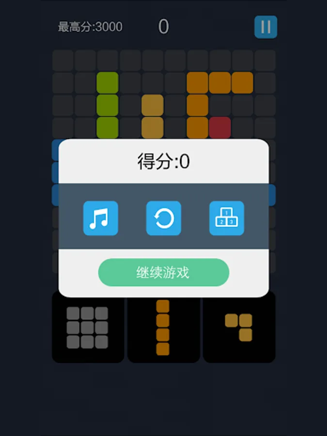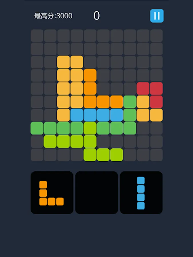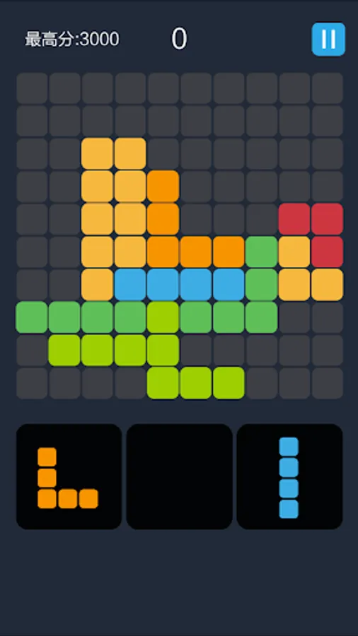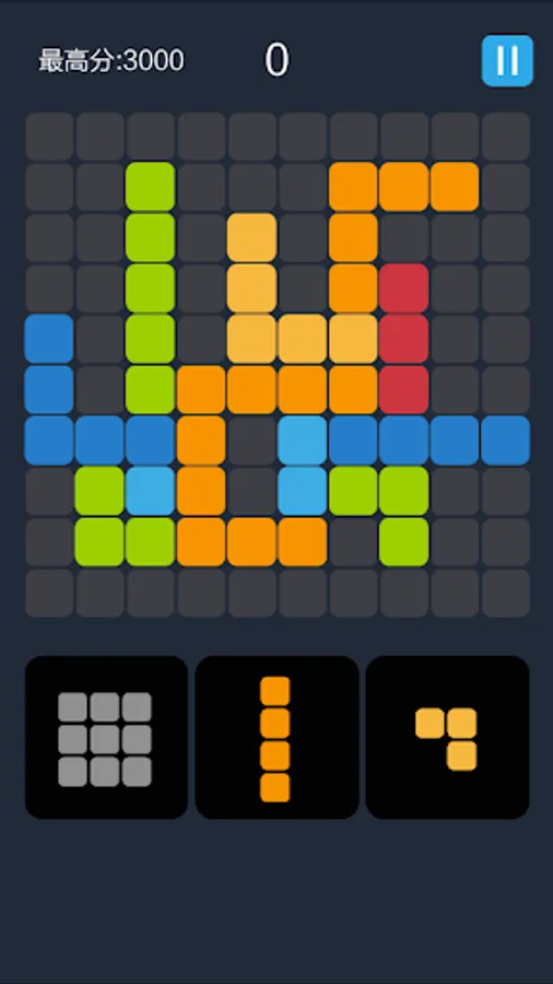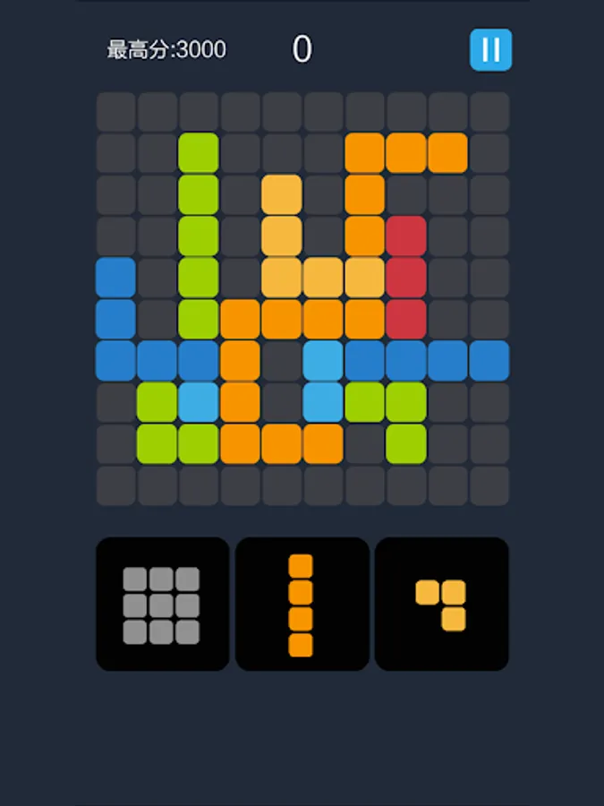 2. Manually place the shape given to the board, as long as the lateral or vertical can be completely filled, can be eliminated or a row, a plurality of rows and columns to eliminate causes cool effect batter, the batter more, The higher the score double!