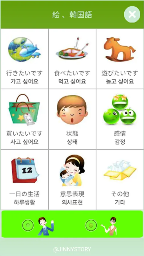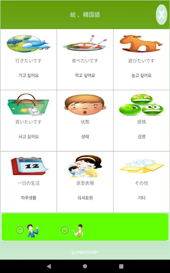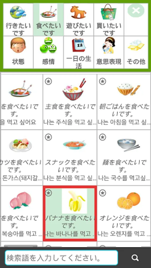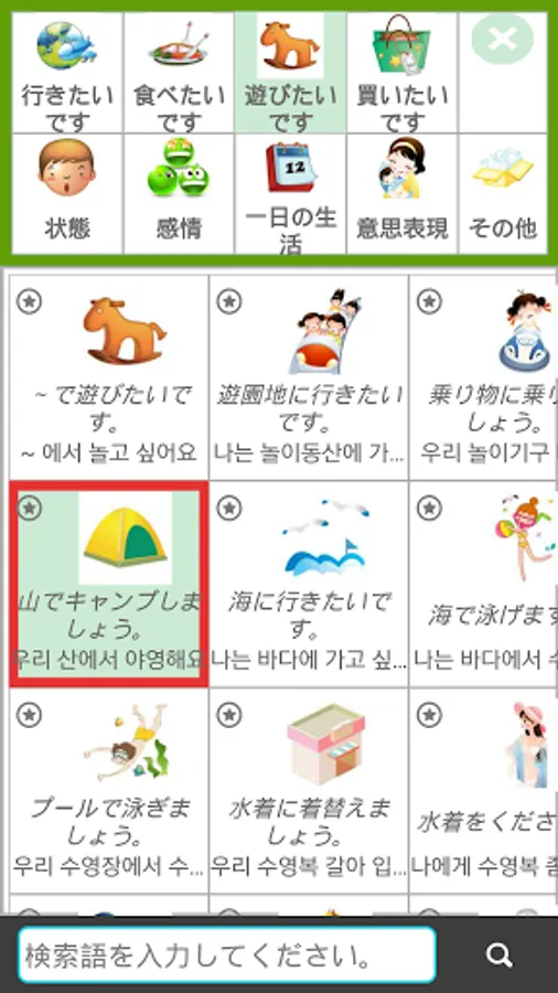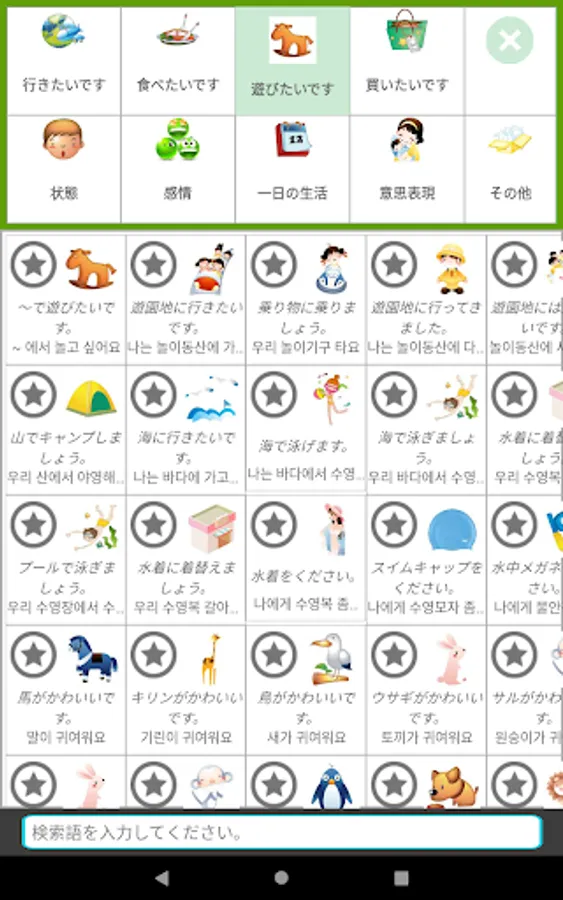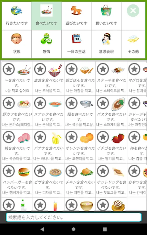 Words that are often used in everyday life are divided into categories, and you can create natural sentences with just a few icon touches.