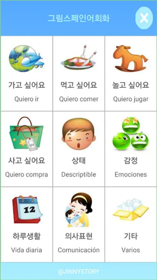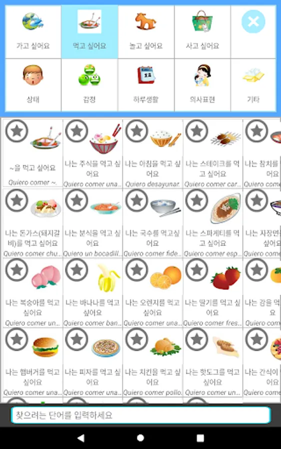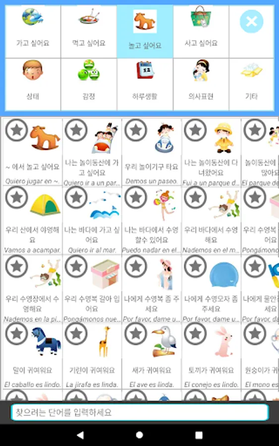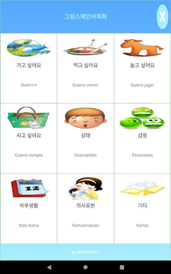 '그림 스페인어 회화' 는 그림 을 터치 하면 해당 하는 문장 이 나오고, 선택한 그림 에 해당 하는 문장 이 자동 으로 나오고, 동시에 음성 으로 변환 되어 나옵니다.
