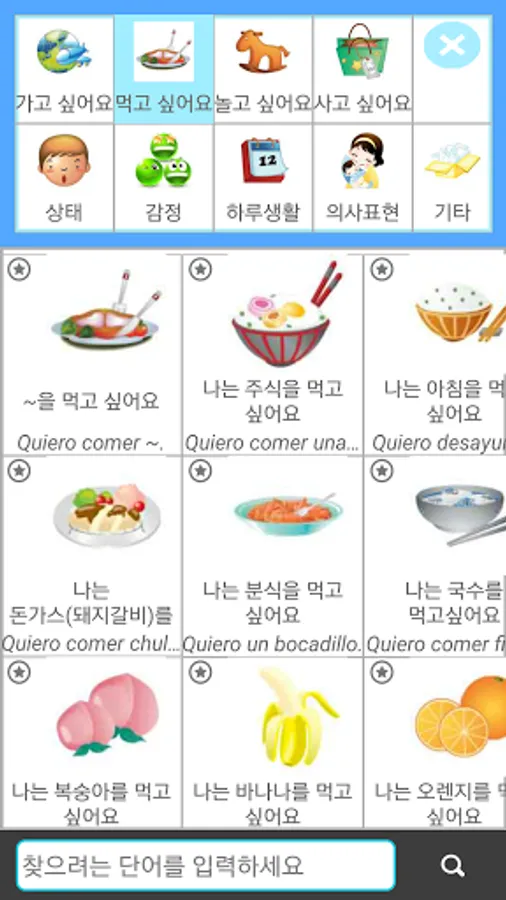 일상 에서 자주 사용 하는 단어 를 카테고리 별로 나누어 몇 번의 아이콘 터치 만으로 자연스럽게 회화 를 익힐 수 있습니다