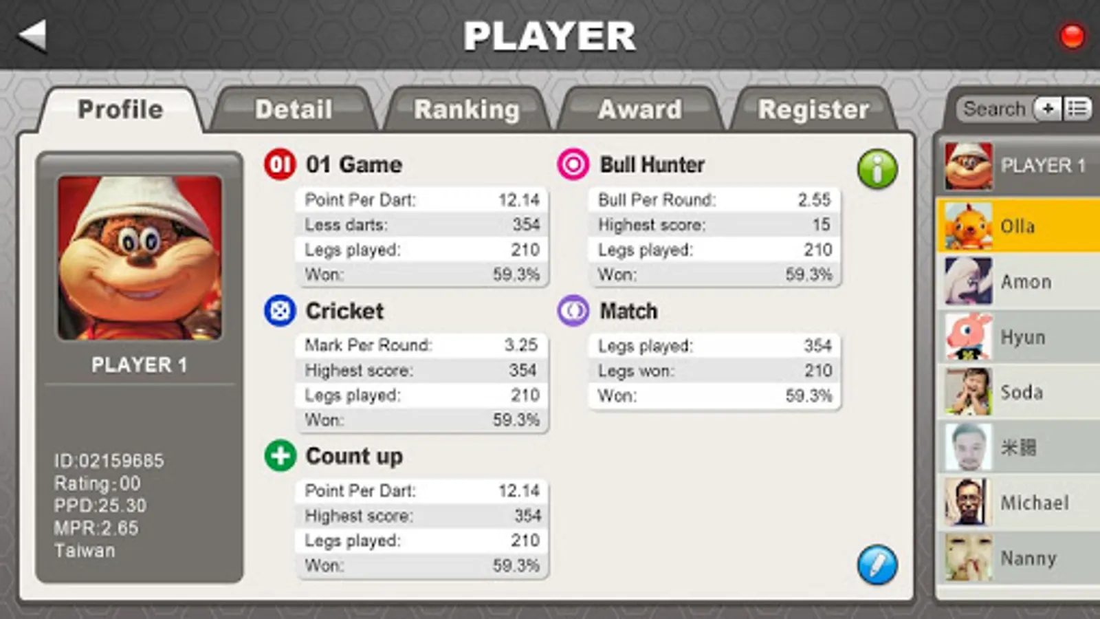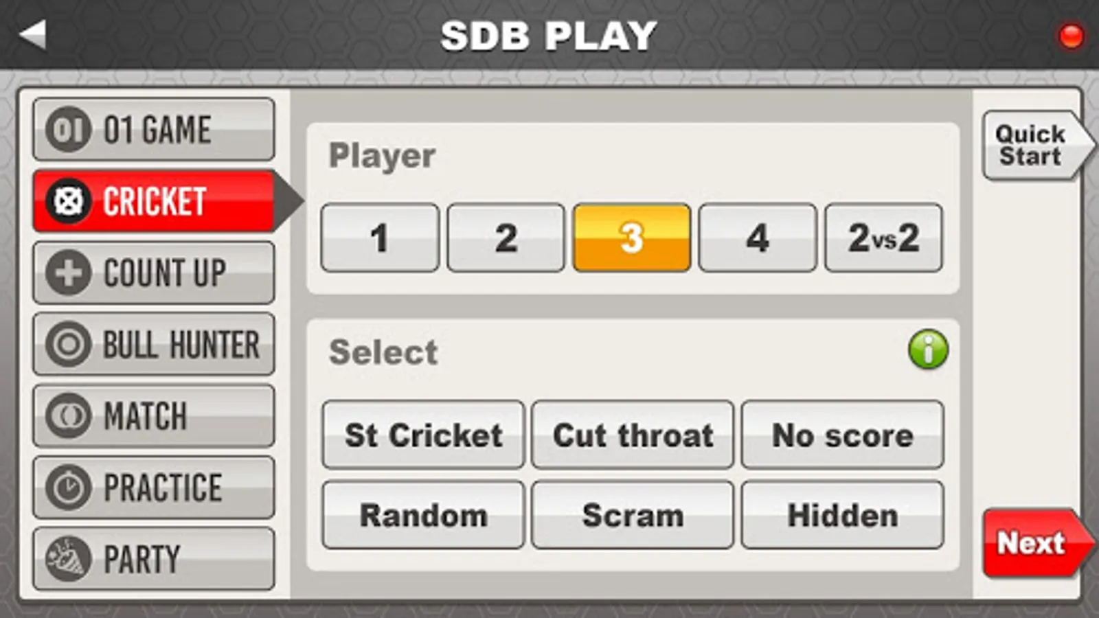 For example 01 Game , Cricket , Count Up , Bull Hunter