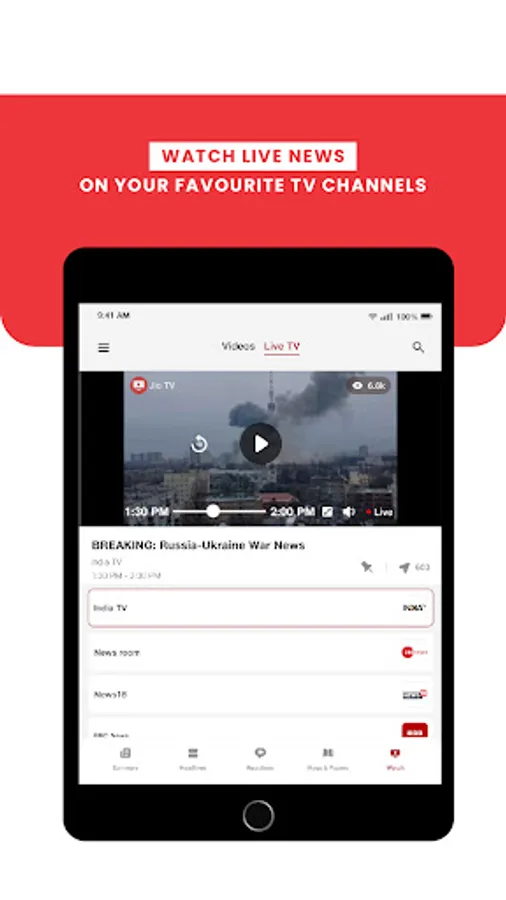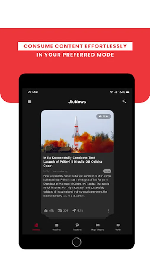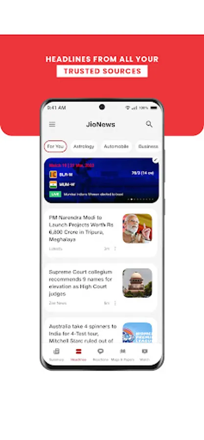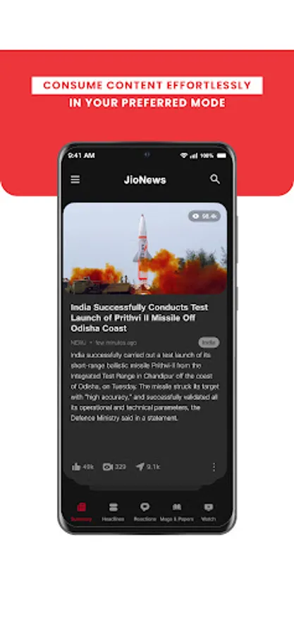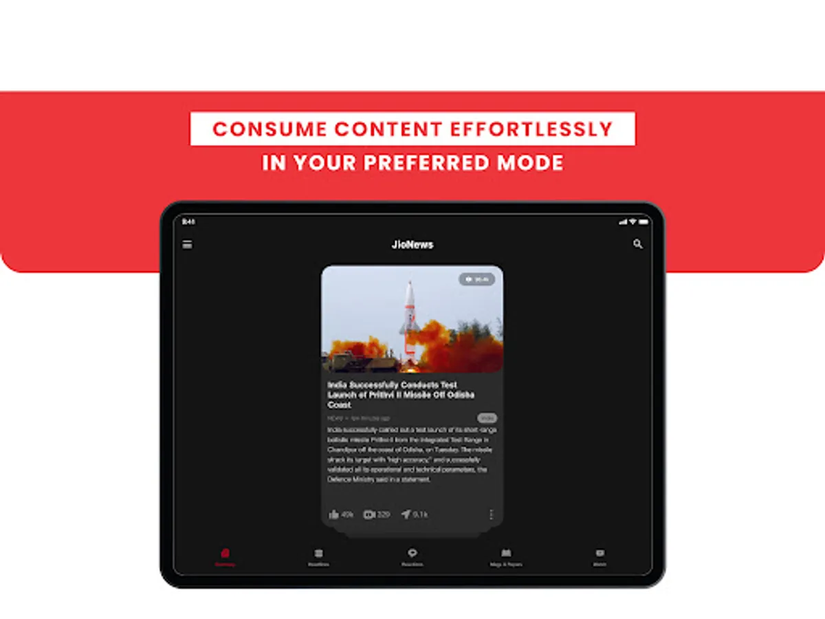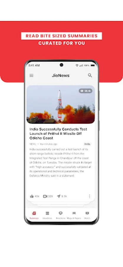 With content availability in multiple formats such as Summaries, Videos, Articles, Live TV, Magazines, Newspapers, Live score cards, fastest notifications and video reactions by fellow users, JioNews is your one-stop shop for all information and infotainment content.