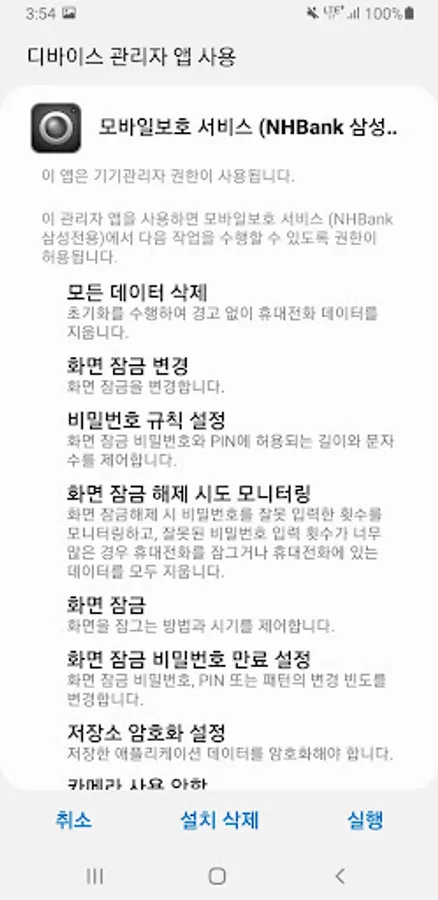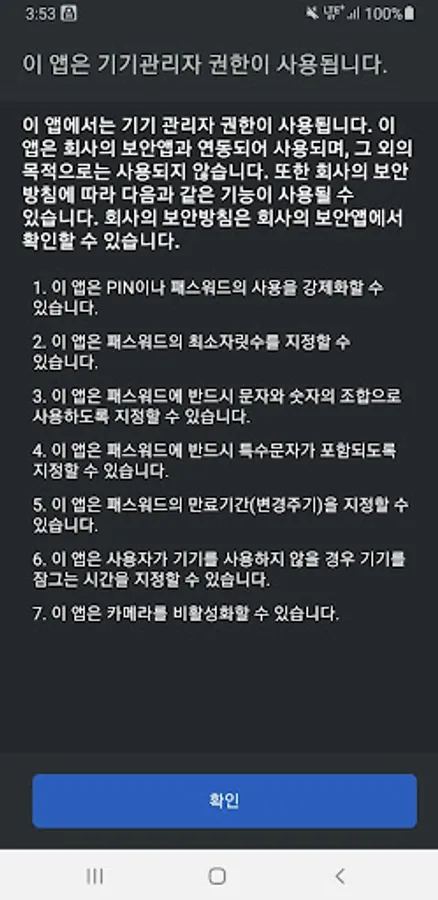 Device administrator privileges are used in this app. This app can never run alone and can't be operated, and must be used in conjunction with the company's security app. Also, it is not used for any other purpose, and the following functions may be used according to the company's security policy. The company's security policy can be found in the company's security app.