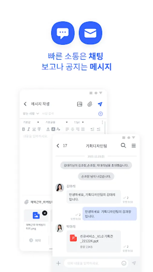 Chat for instant communication, message for reports or announcements. You can communicate in two styles to suit your work situation.