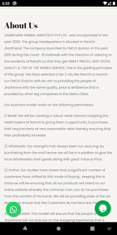 JHARKHAND HERBAL AGROTECH PVT.LTD. was incorporated in the year 2003. The group Headquarters is situated in Ranchi Jharkhand. The company launched its FMCG division in the year 2021 during the Covid- 19 outbreak with the intention of catering to the residents of Ranchi so that they get GREAT PRICES, VERY GOOD QUALITY & TOP OF THE WORLD SERVICE. This is the guiding principles of the group. We have selected a tier 3 city like Ranchi to launch our FMCG Division with an aim to providing the people of Jharkhand with the same quality, price & ambience that is provided by other big companies in the Metro Cities.