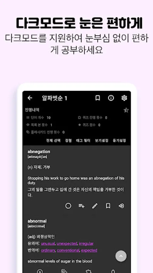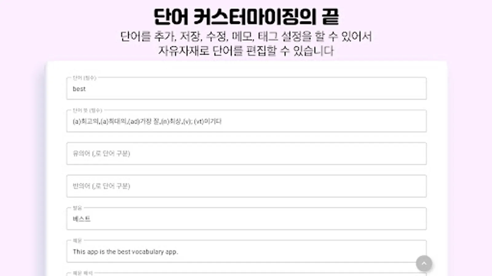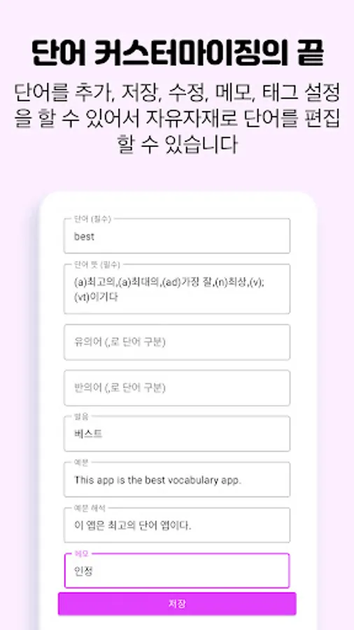 Among the English letters of words, Korean meaning, English example sentences, English example sentence interpretation, synonyms, and antonyms