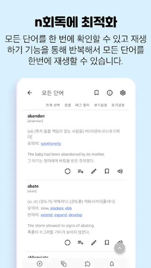 Among the English letters of words, Korean meaning, English example sentences, English example sentence interpretation, synonyms, and antonyms