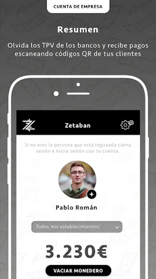 Whether you are self-employed or a company, with Zetaban you can dispense cash to those customers who want to pay by card, whether or not they have downloaded our APP, without discounting commissions or maintenance costs. It is an intuitive and easy to use APP and in the registration, it will not take even 1 minute.