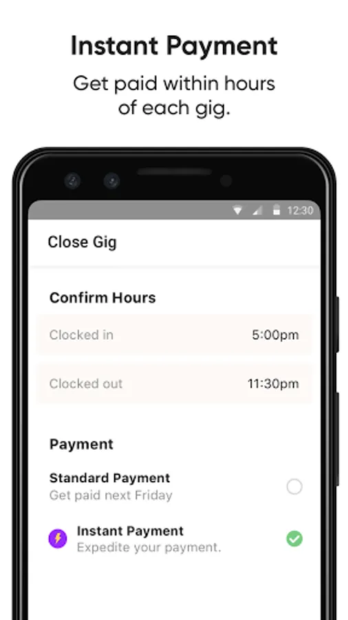*Instant Pay is conditional on the achievement of performance criteria, a current/active and supported debit card, a supported tax profile, and approval of hours worked. Certain gigs may require additional time to verify worker hours and in such cases, payment may take longer to process.