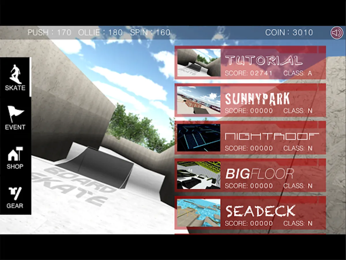 Main progress is to unlock new stages by high score. There are several modes "ScoreAttack", "FreeRide", "TimeAttack", "AcrossTheDeck", "DownhillJumpSpin". Enjoy freedom.