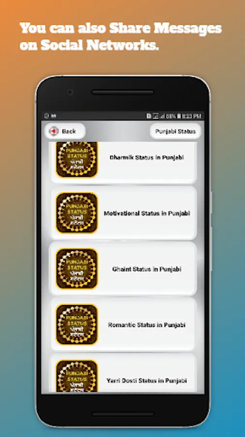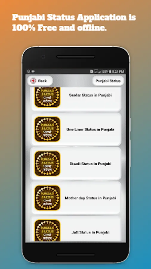 Latest collection of Punjabi status to express your feelings and situation. Are you looking for Punjabi status then this is the right App to get punjabi status we have collected 55+ Category and 6300+ punjabi status. You can also Share Messages on Social Networks. punjabi status application is 100% free and offline , no need of internet connection.
