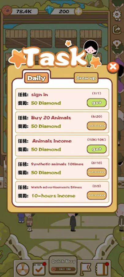 Based on the "two in one" play method, two animals are combined into a higher level animal composite game. The more animals there are, the more visitors will visit the park, and the more expensive the tickets will be after synthesizing higher-grade animals. The tickets can be used to buy more animals and expand the zoo.