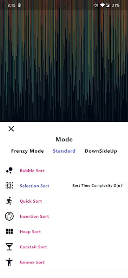 AlgoVisualizer is visualization tool which picks up right where traditional sorting visualizers left off. With the ability to choose from the 7 most popular sorting algorithms and mix and match designs and colors, this app lets you personalize the visualization process like never before. Choose from Tim Sort, Heapsort, Quicksort and many more! Combined with the Frenzy, Standard and DownsideUp mode you can also choose from color themes including Summer Hues, Arctic White, Ice-cream Sandwich, Ketchup Red and Kindergarten Notebook.