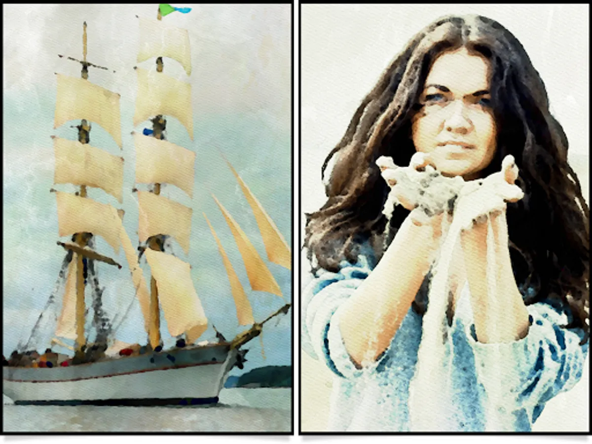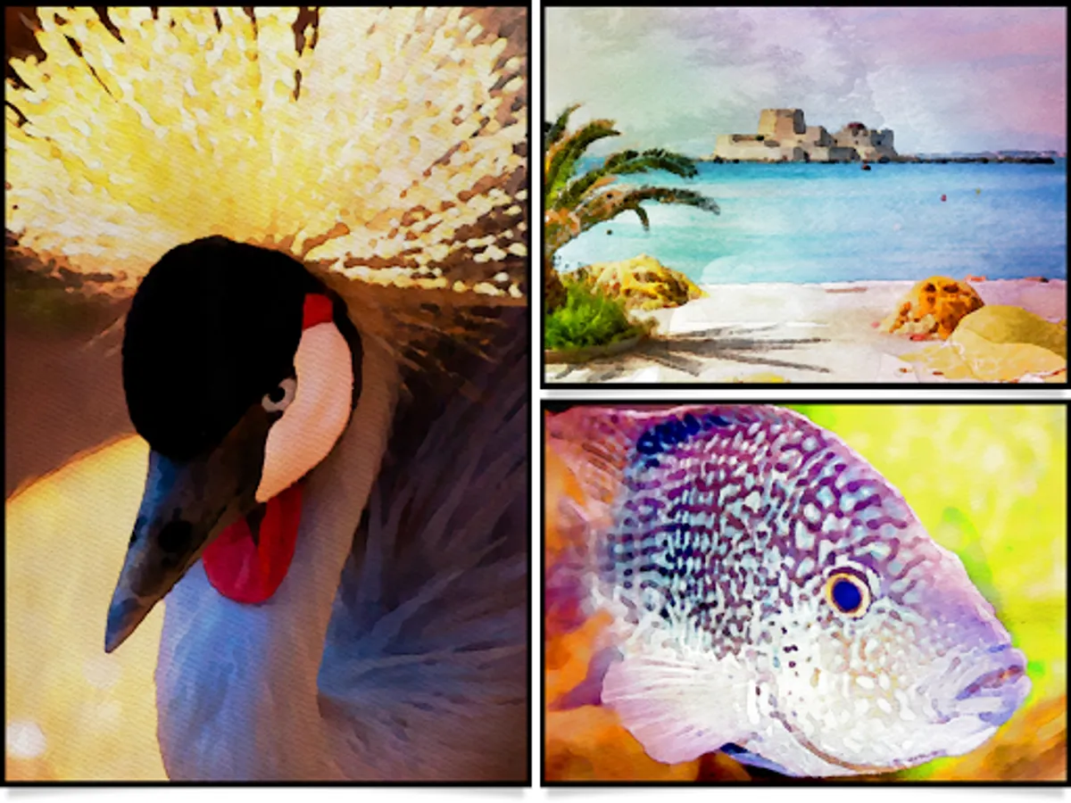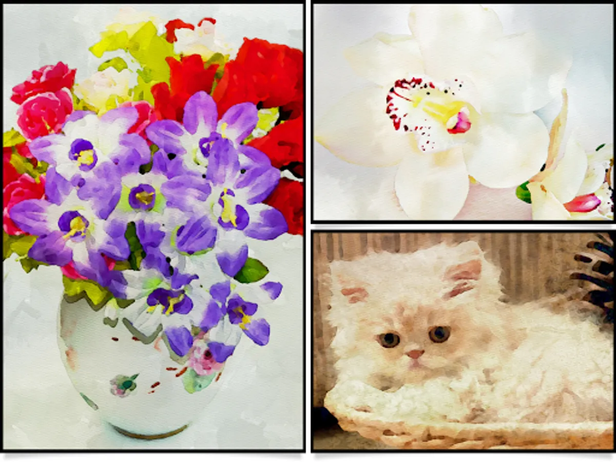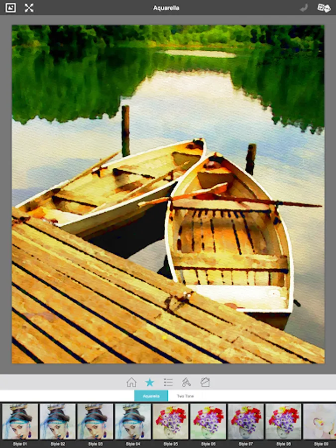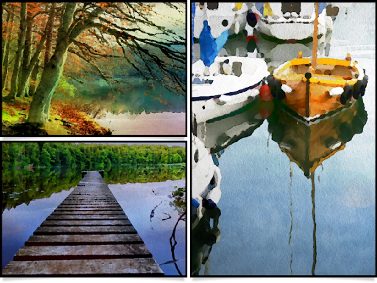 •Two professional-quality aquamedia styles: A traditional one applies fluid brush strokes and colorful washes; and a two toned one washes your image with soft color combinations