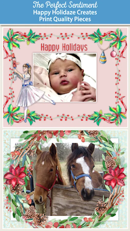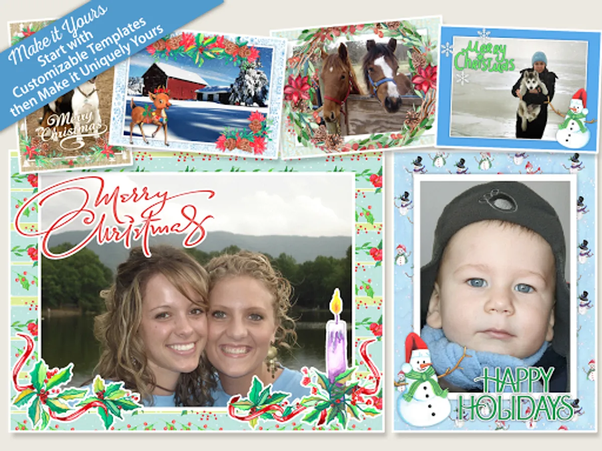 Happy Holidaze, in typical JixiPix fashion, is all about adding creative touches to your holiday cheer. Start out by antiquing your photo, choose a festive background pattern, and embellish it with incredible pieces of art—all hand painted—to make your photo design fun, elegant, and cheerful.