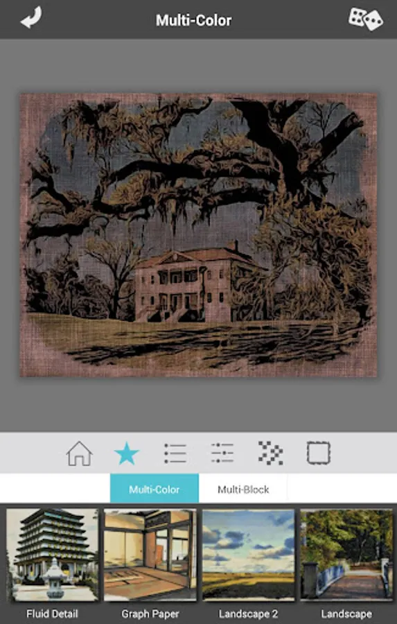 •The Multi-Block style uses 5 blocks of color pulled from your original image then divides the colors across your artwork giving the look of carving a separate woodblock for every color. The cool thing about this style is the ability to "Randomize Colors" throughout your artwork and the ability to replace any or all of these colors, using the full-spectrum color picker. You can achieve simple to exaggerated color results using this process.