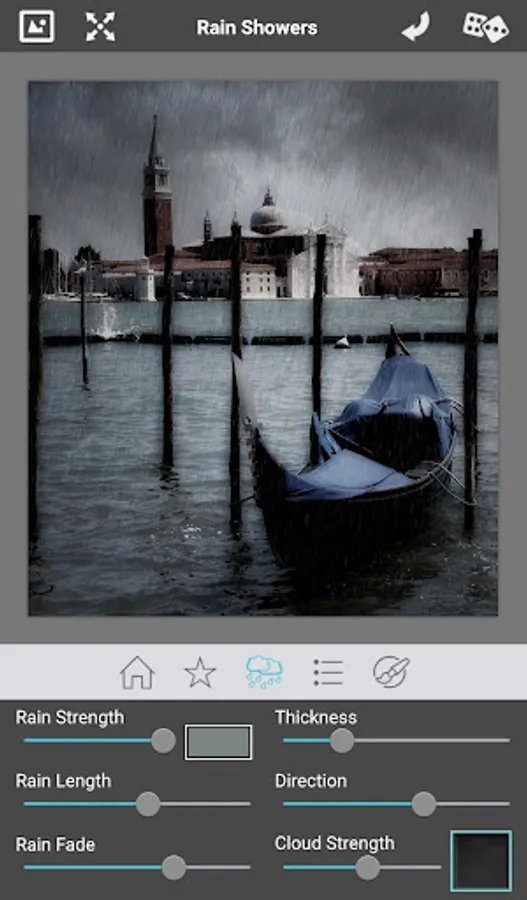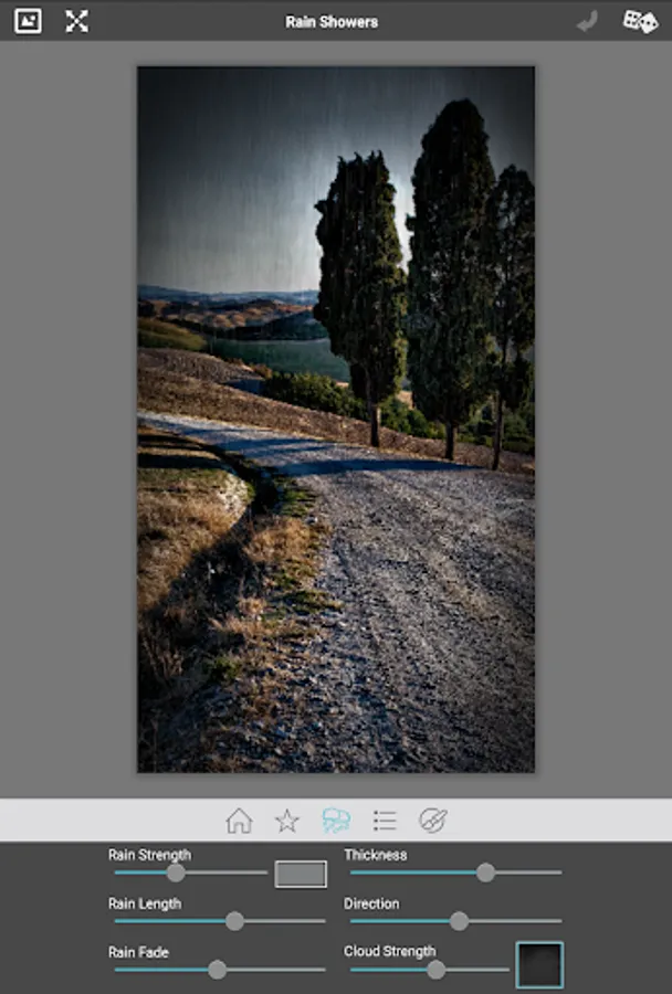 Rain Showers—dramatically darkens the scene to look like a stormy overcast day, or lighten up the colors for a soft misty one with light rainfall