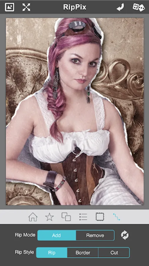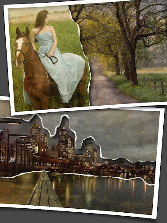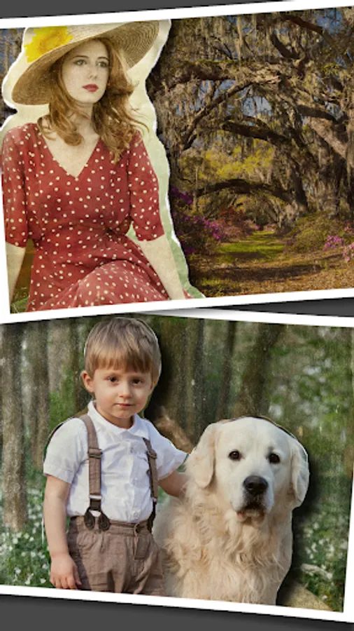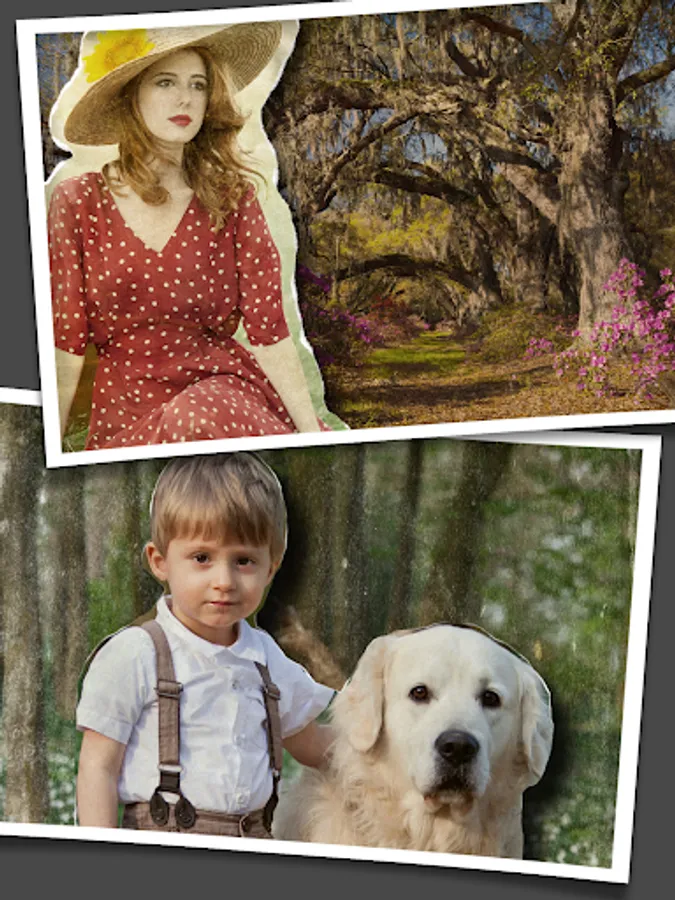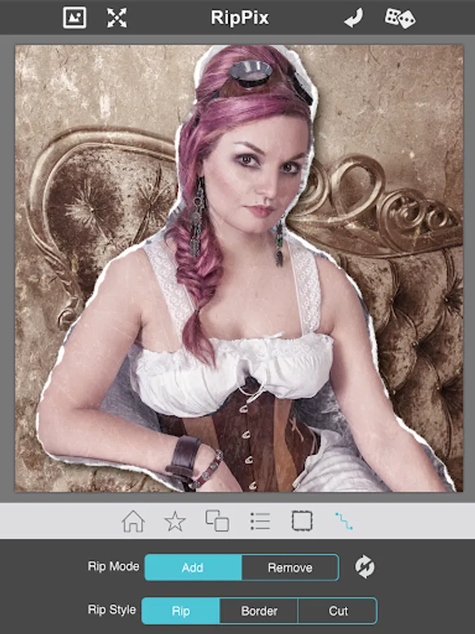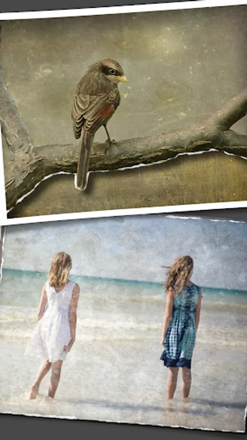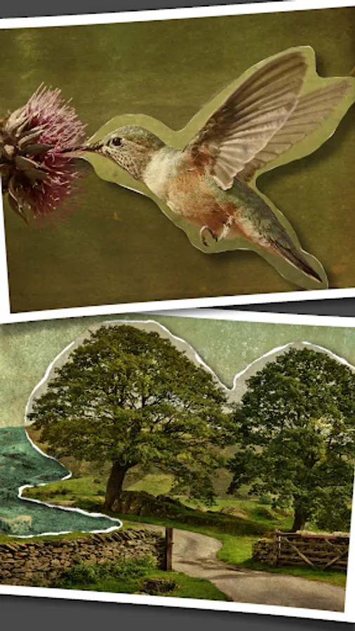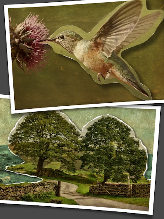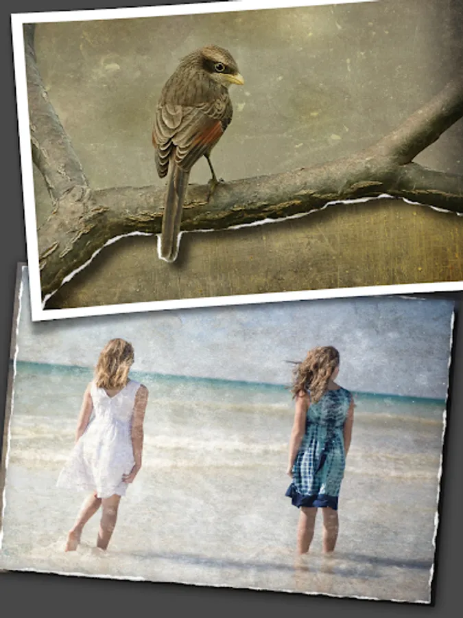 RipPix uses worn and stained photo effects to give your photo a nostalgic quality then gives you the ability to turn any subject into a center detail by simply tracing around on the image. Cut out a bird, flower, person or tree then size, rotate and move it around on the background photo to create a beautiful paper accent piece with soft shadow.