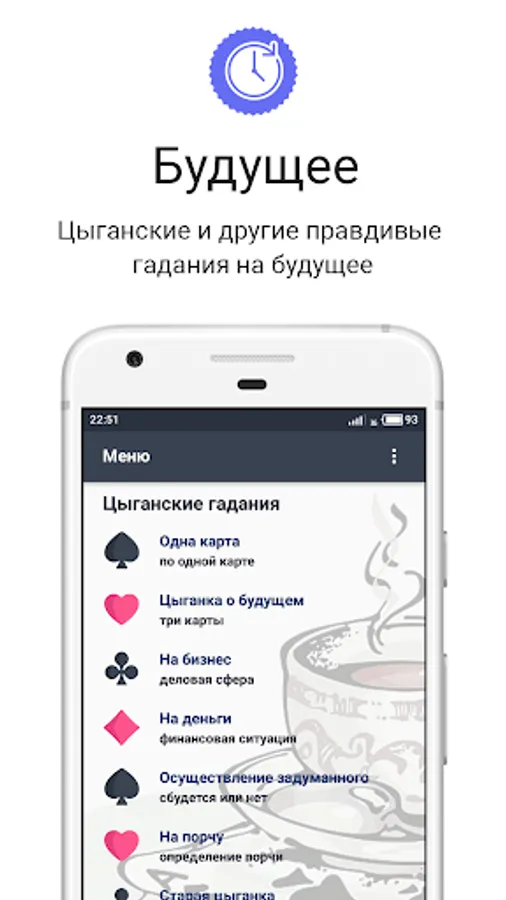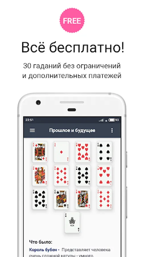 The application was checked by professional fortunetellers, and it works on the same principle as real fortune telling on cards in the real world. You shuffle the deck and get a prediction of the future. If you know how to guess, you can do any fortune telling on your own using a paper deck of cards.