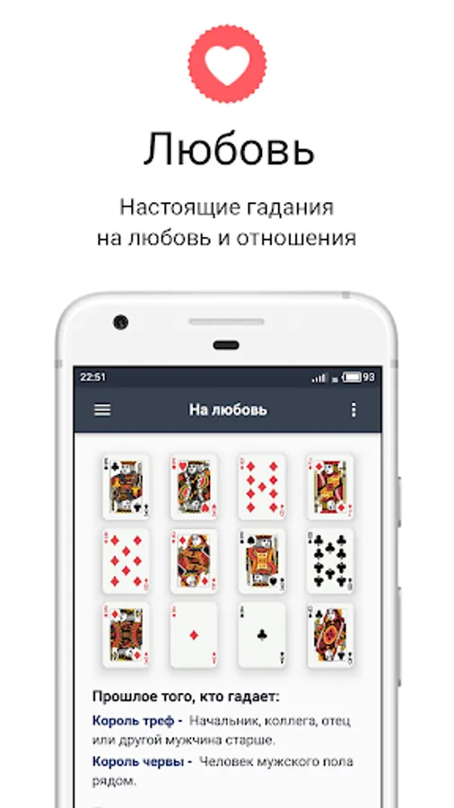 Many have already noticed that not only a real fortuneteller can really throw fortune-telling cards. Fortunetelling app combines the experience of ancestors and modern technology. Prediction of the future, fortune-telling on love and fate, we even have gypsy fortune-telling! By installing this program, you will receive a virtual deck with a description of the cards, and you will find that guessing yourself is not so difficult.