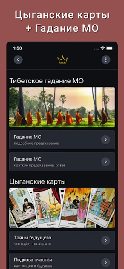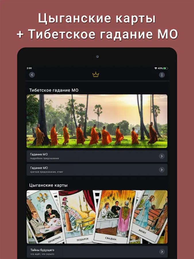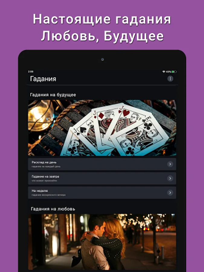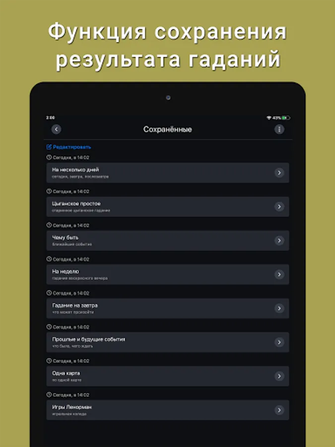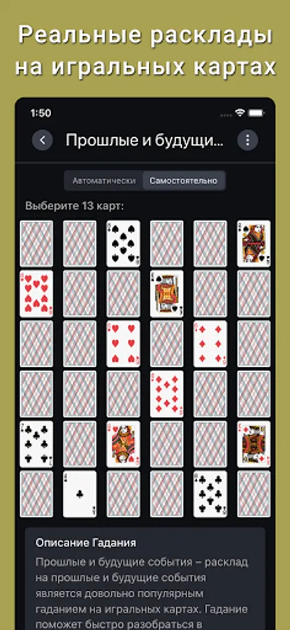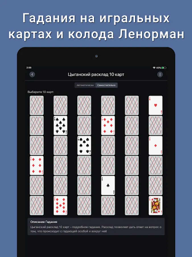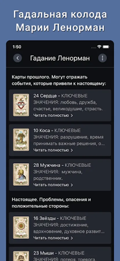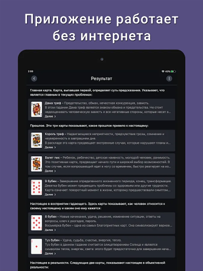 In this application, the fortune-telling process is as plausible as possible. You simply select the desired alignment and get a prediction. You can guess with the help of a playing deck or choose Lenormand cards.