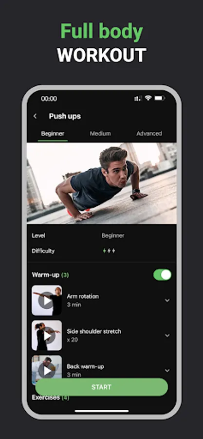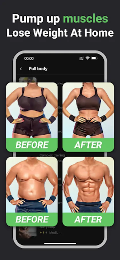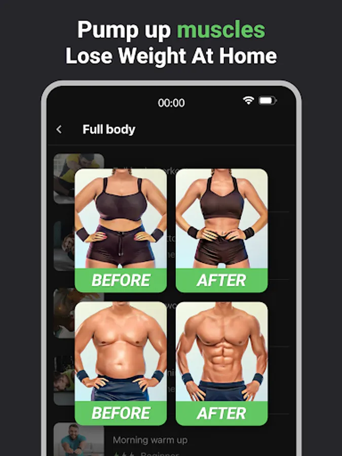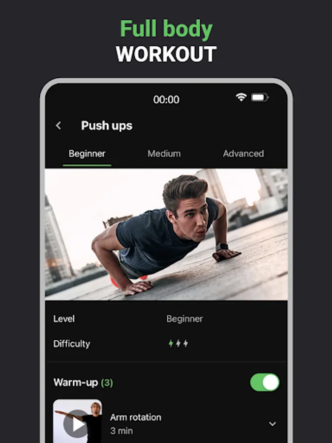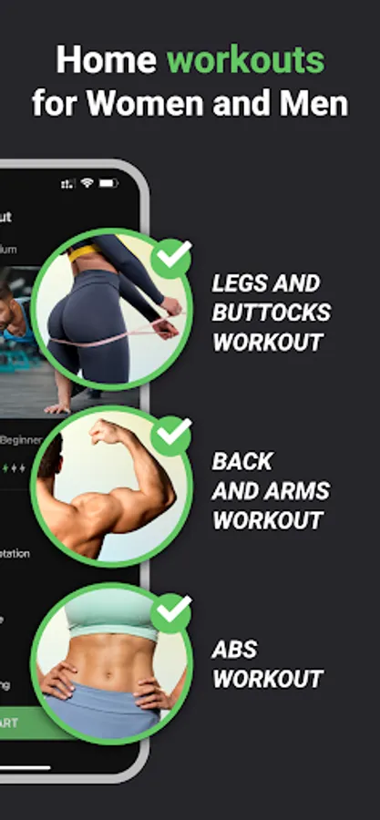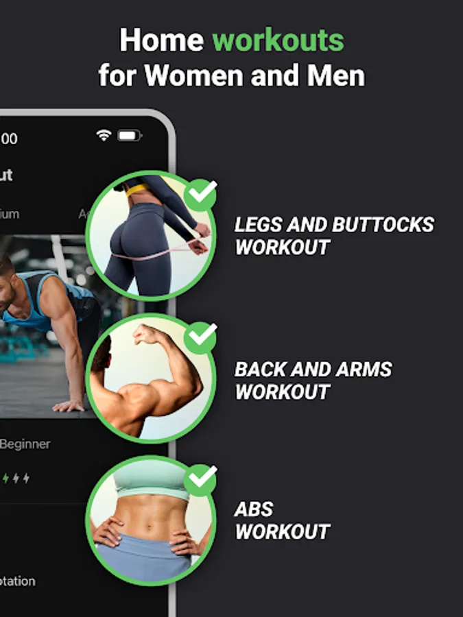 Total body fitness: Glutes & Legs, Arms, Shoulders, Abs & Core, Push-ups, Sit-ups, and more for both men and women in our application.