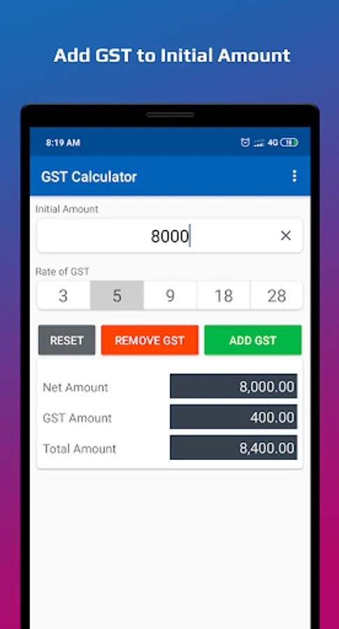 Calculate SGST, CGST and IGST of Goods and service tax in this app.
