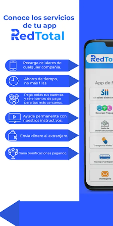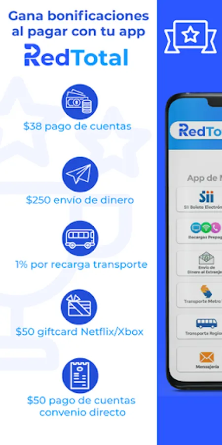 Red Total is a specialized Chilean application for multiple user services, you only have to top up your balance to use it and earn bonuses.