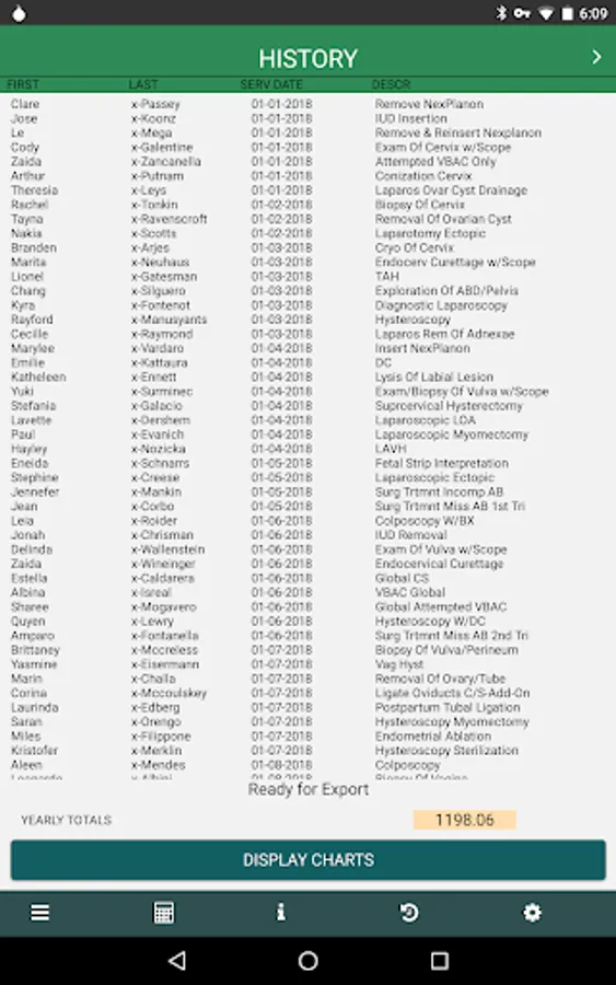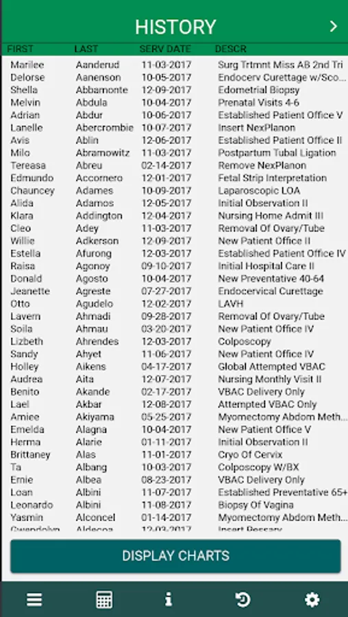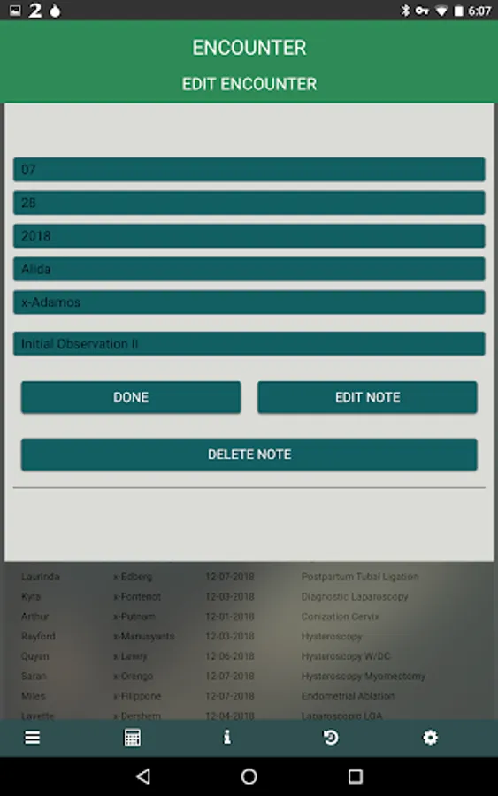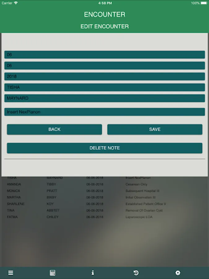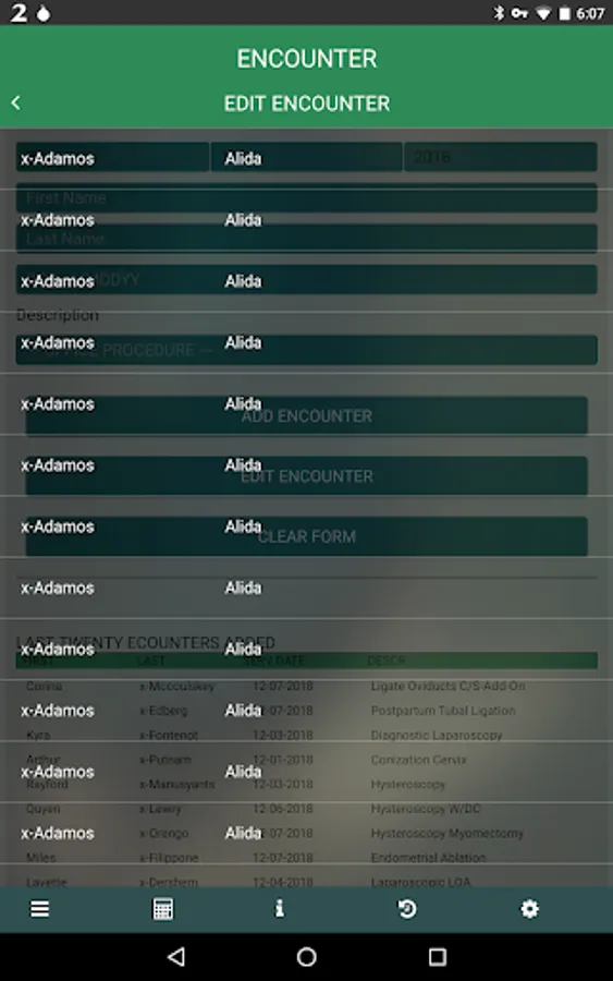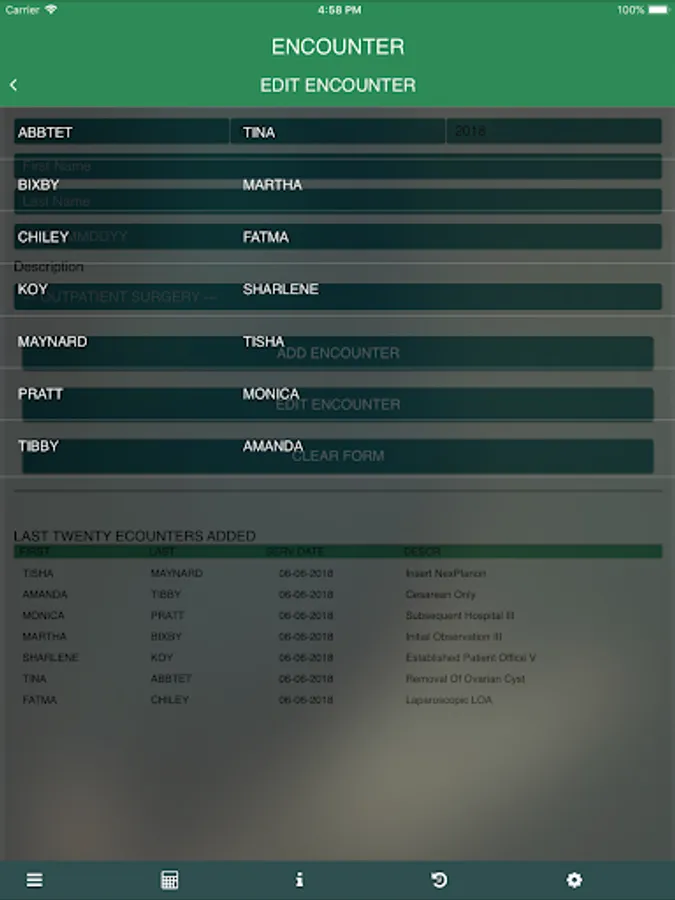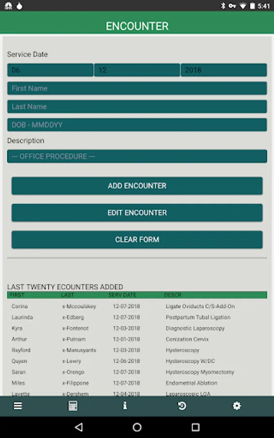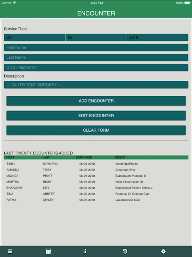 Simply add your encounter information with date, first name, last name, and date of birth. My RVU OBGYN Tracker will record this information locally. You can go back and edit or delete encounters if needed. Quickly view the last twenty (20) encounters added.