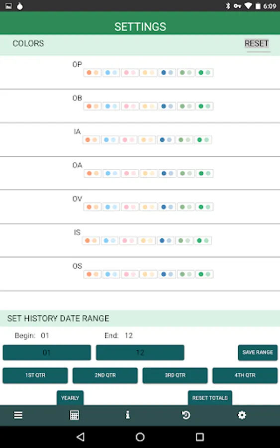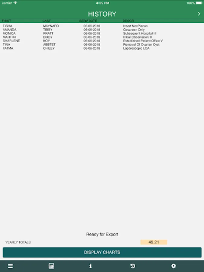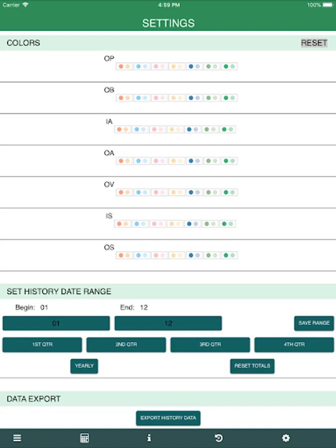 Change encounter category section colors. Set history tab totals to monthly, quarterly, or yearly to allow for generating specific reports. Export all data to CSV format to save and in your favorite spreadsheet app.