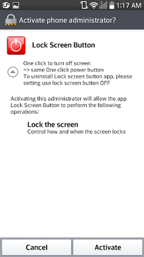 Uninstall : Settings > Security > Device administrators to shut off Lock screen button