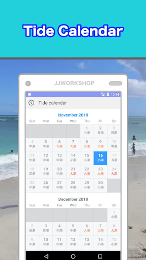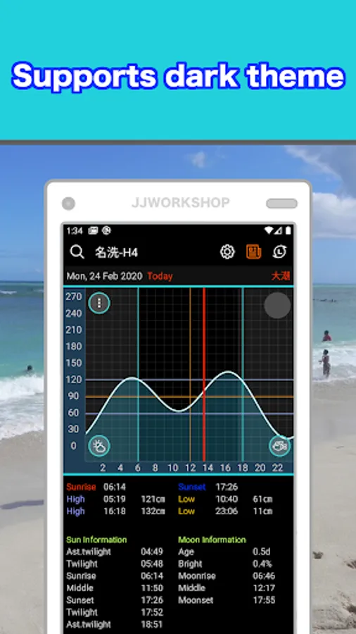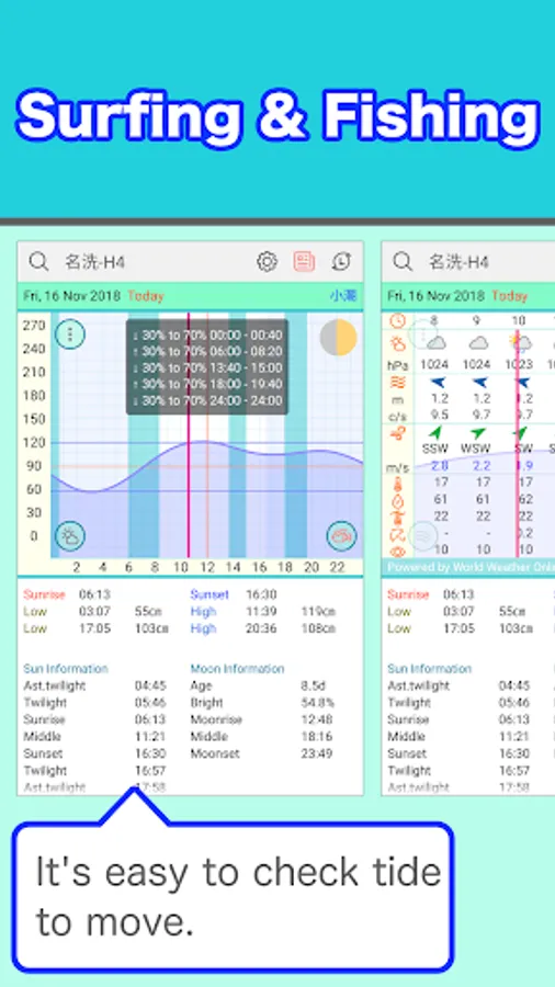 The app show a flashing mark on the tide graph current time. so you can check easily the tide moving. Also you can check a sunrise and a sunset from graph.