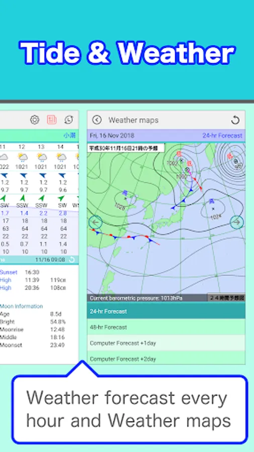 The weather data is showed together the tide graph and numeric datas. so you can predict a future's condition of waves and tides.