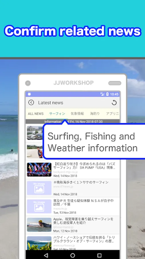 When there are new news, it's noticed by the icon marker on the app. You can read news such as surfing, fishing, this app's information and other.