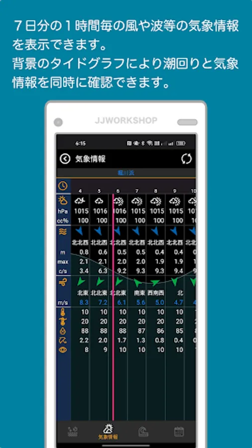 The tide point card can display the tide graph, hourly weather information (wind and wave information) for 7 days, coastal wind and wave information, and tide calendar by switching tabs.