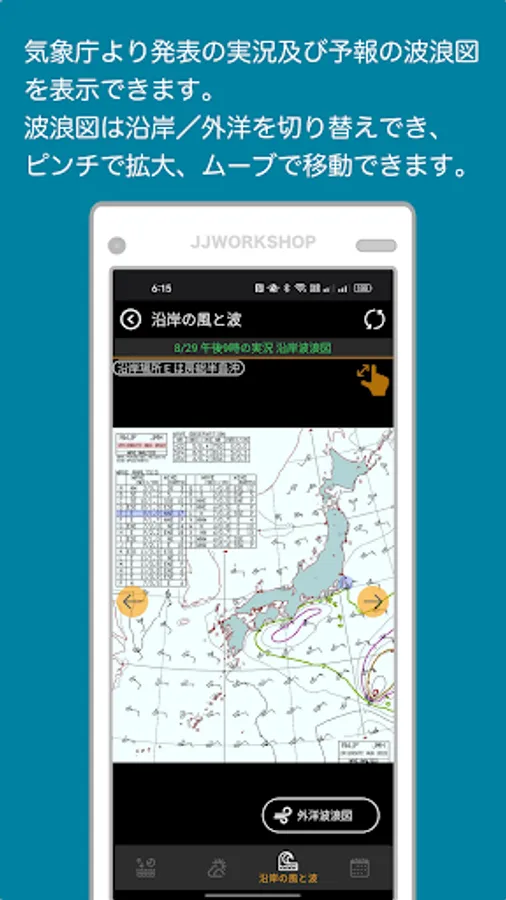"Weather charts", "Nowcast" cards, and "Coastal wind and wave information" on tide point cards use data from the Japan Meteorological Agency website. If the site structure of the Japan Meteorological Agency changes or if the information is not updated, the app will not be able to display the data correctly.